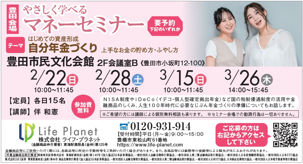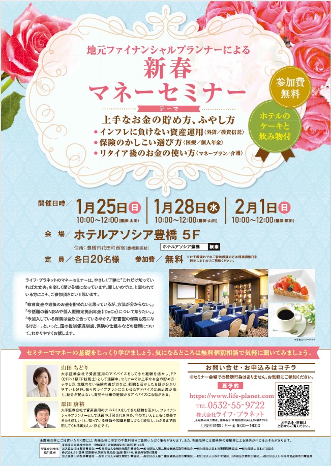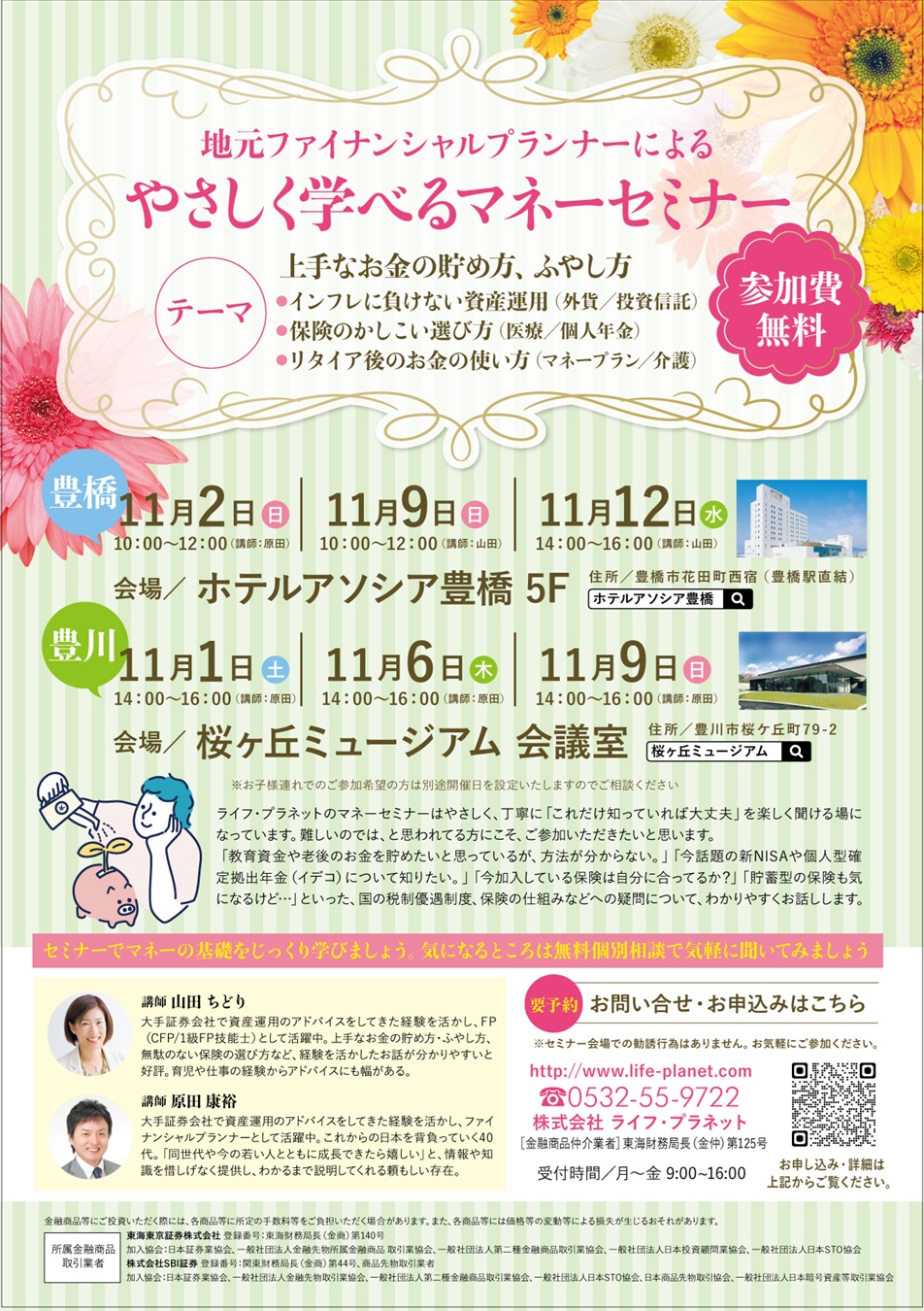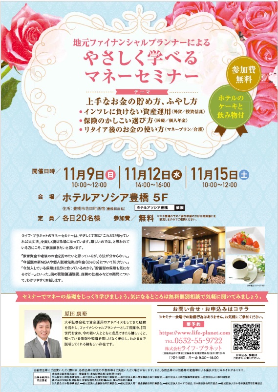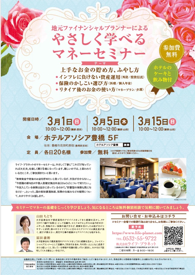 名古屋・豊田・豊橋・浜松・大阪等で弊社ファイナンシャルプランナーや外部の特別講師を招いてマネーセミナーを定期的に開催しております。保険の話や低金利時代の資産運用、自分年金作りやNISA(ニーサ)など、幅広くテーマを設けております。