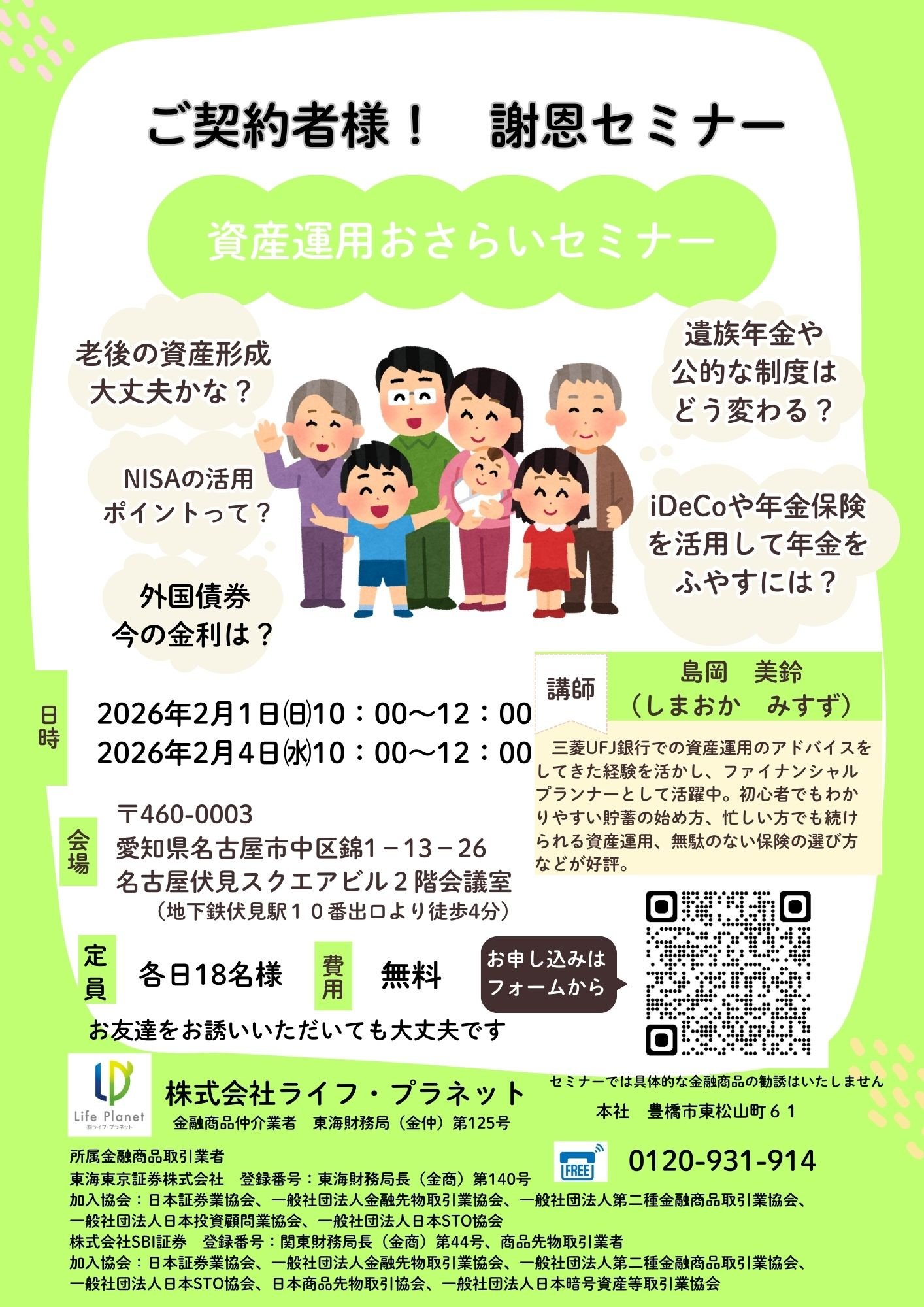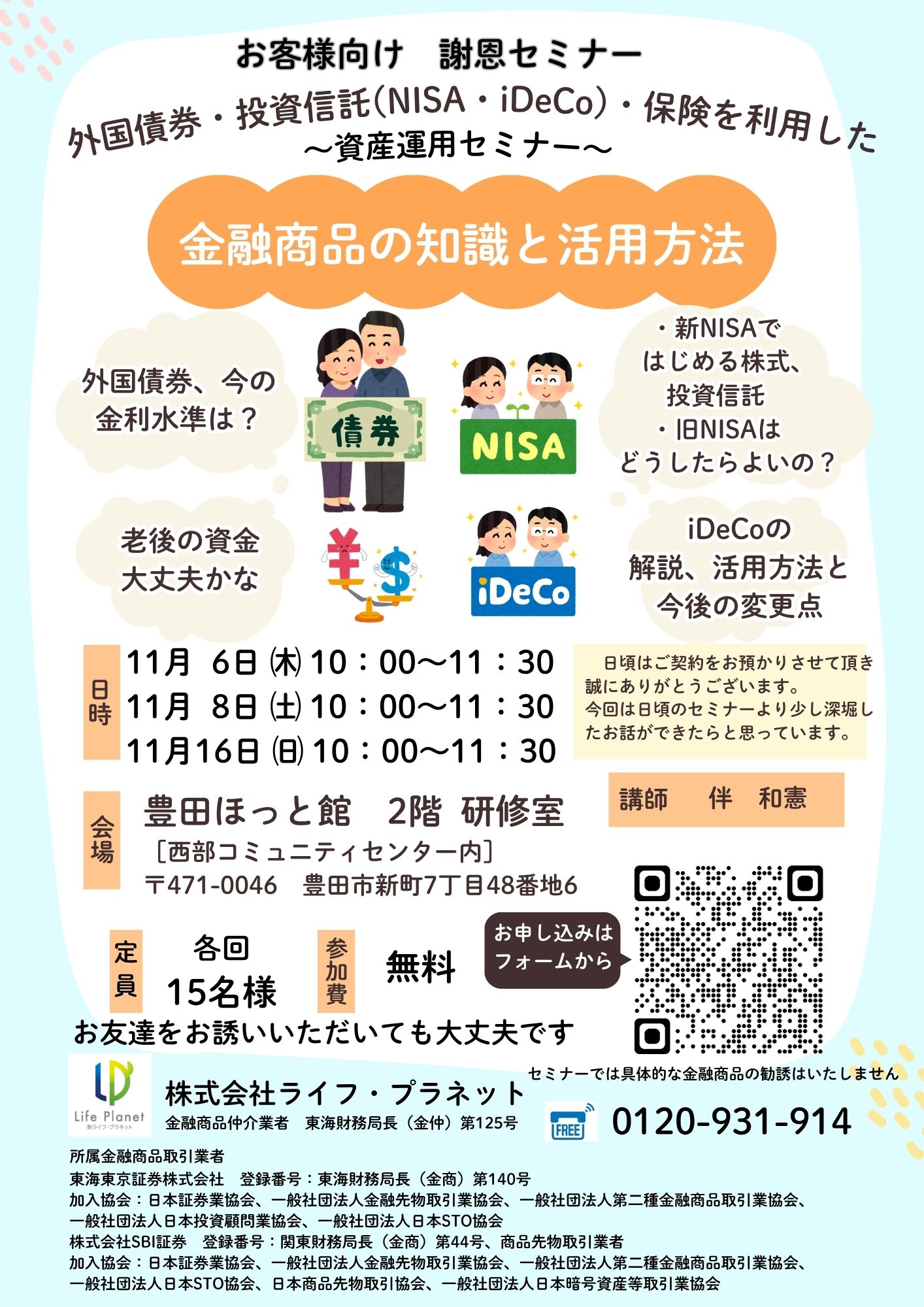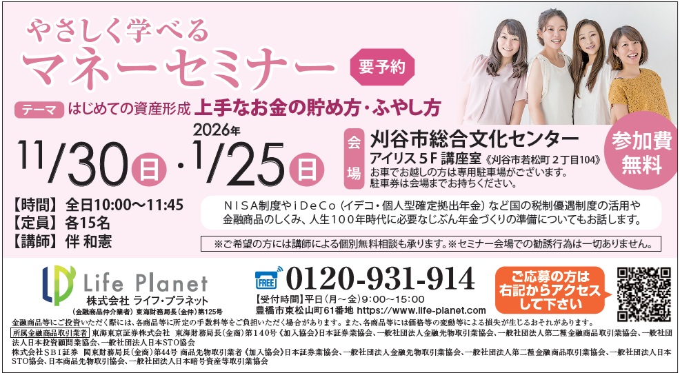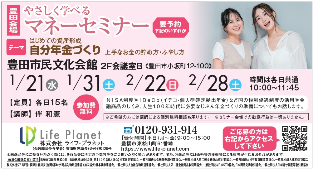 名古屋・豊田・豊橋・浜松・大阪等で弊社ファイナンシャルプランナーや外部の特別講師を招いてマネーセミナーを定期的に開催しております。保険の話や低金利時代の資産運用、自分年金作りやNISA(ニーサ)など、幅広くテーマを設けております。