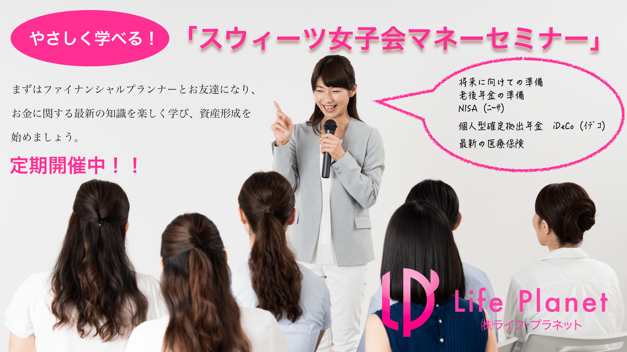 実績あるファイナンシャルプランナーから、貯蓄・保険・住宅・運用・老後・年金・退職金・介護・相続などに関する内容をセミナーでアドバイスさせていただきます。外部講師を招いての共催セミナーや、女子会セミナー、やや深く知識を蓄えるセミナーなど、ご自分にあったテーマでご参加ください。