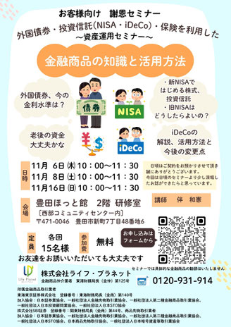 2025/11/06 豊田開催!謝恩セミナー 【会場】豊田ほっと館/2F 研修室 【日程】 11月 6日(木)10:00~11:30 11月 8日(土)10:00~11:30 11月16日(日)10:00~11:30 【講師】伴 和憲 【費用】無料 【定員】各回15名様 詳しくは「続きを読む」をクリック! 豊田開催!マネーセミナーのご紹介 ライフ・プラネットのマネーセミナーはやさしく、丁寧に「これだけ知っていれば大丈夫」をはじめての方にも、楽しく聞いて頂ける場になっています。 難しいのではと思われる方にこそ、ご参加頂きたいと思います。 先日行われたセミナー風景です。ご参加ありがとうございました♪ ⇩このセミナーに申し込み⇩ tagPlaceholderカテゴリ: セミナー
