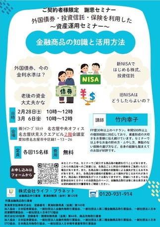 外国債券・投資信託(NISA・iDeCo)・保険を利用した資産運用セミナーです。